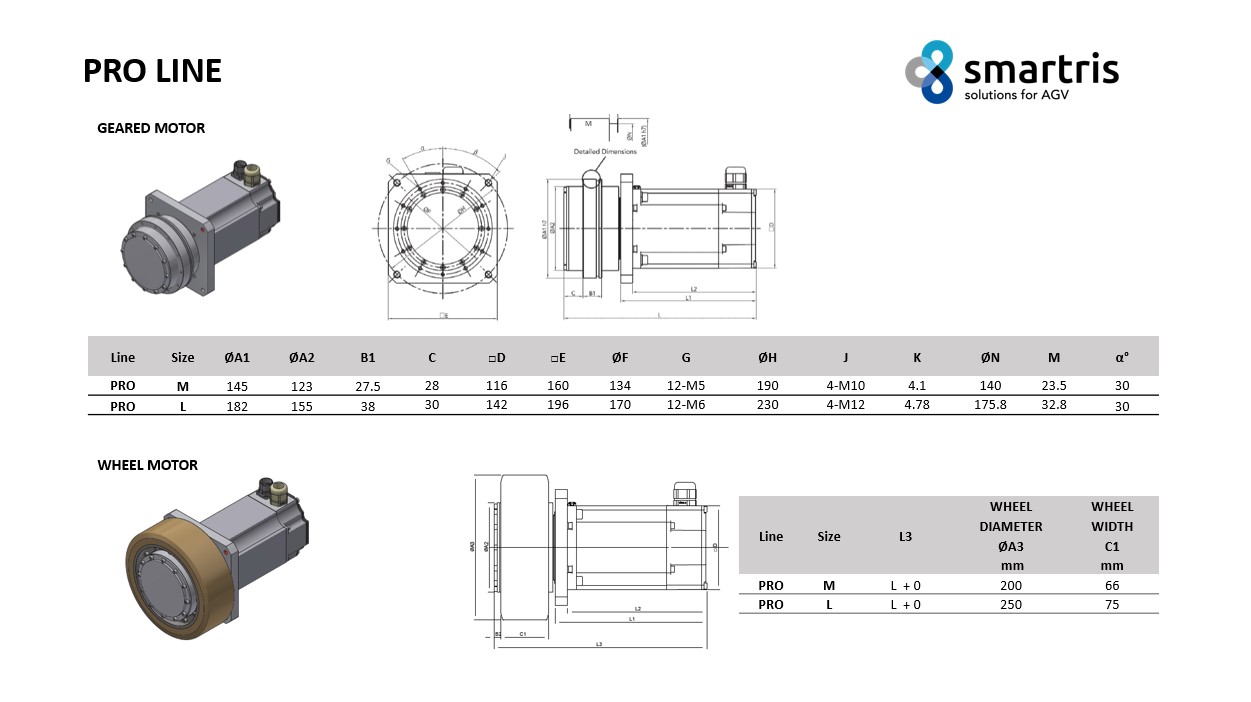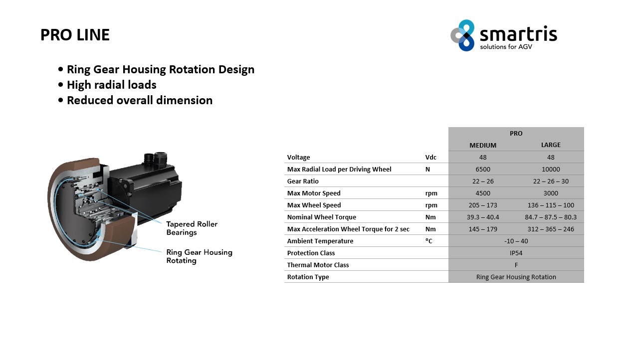 Smartris is a Smart Wheel Drive Solution for AGV consisting of Gear, Servo Motor, Drive & Wheel. Developed for various types of Automated Guided Vehicle (AGV) to deliver highest performance, maximum precision and reliability of integrated components. Integration into AGV needs to be as space-saving as possible. Decisive is the dimension of relevant components. Our solutions are among the shortest on the market because the gear is in-wheel. This means easier contribution to lower floors and effective use of space inside AGV.