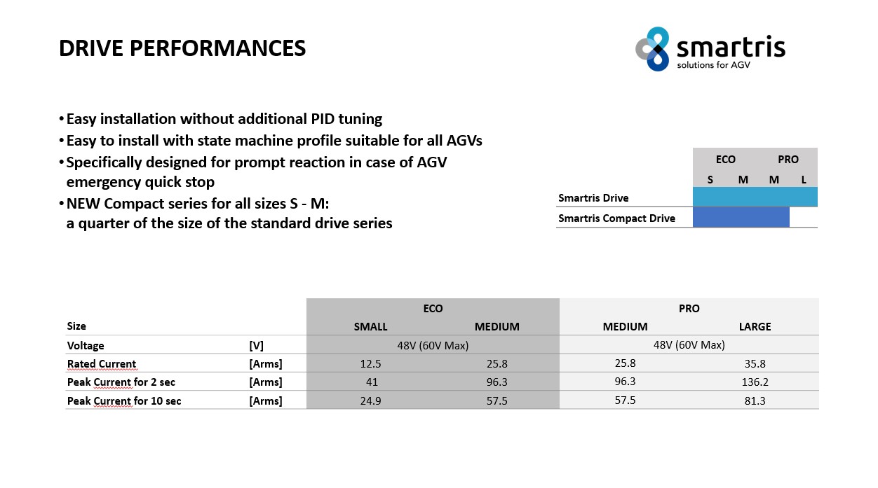 NEW: With four times reduced volumes but optimized performance, Smartris Compact Drive maintains the same functionality as always, with the advantage of being an ultra-space-saving plug & play solution. State-of-the-art extremely compact drive, it leaves more space for other equipment devices inside the AGV.