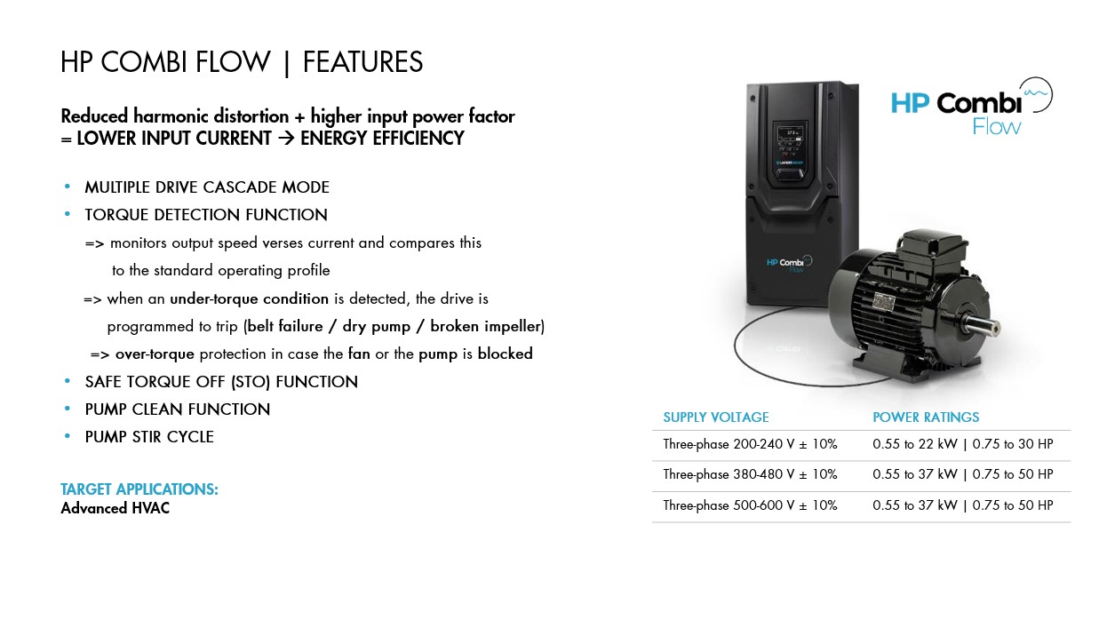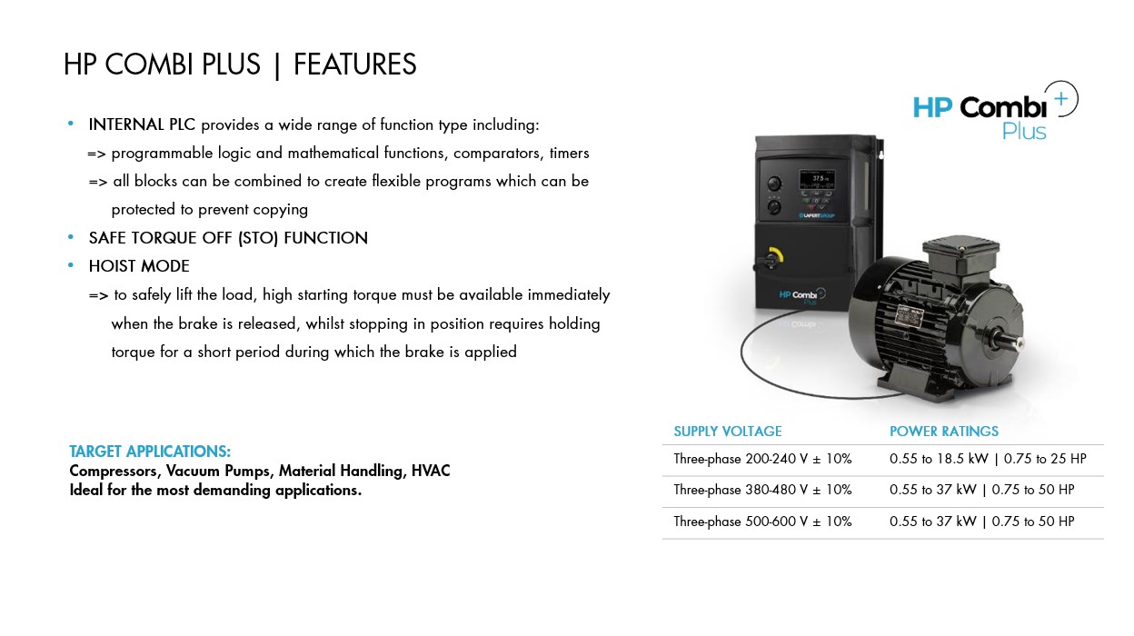 Le diverse configurazioni disponibili permettono di coprire una vasta gamma di applicazioni industriali e commerciali. Infatti, HP Combi è studiato sia per applicazioni a coppia variabile, tipicamente in HVAC, sia per applicazioni a coppia costante come material handling, compressori ad aria e pompe per vuoto.