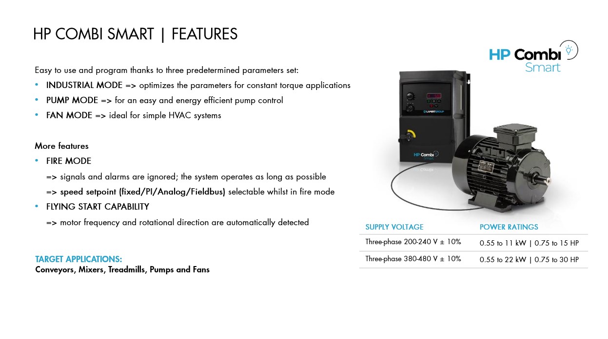HP Combi è due in uno, un matrimonio innovativo tra motore sincrono a magneti permanenti e azionamento a frequenza variabile. Il pacchetto Combi